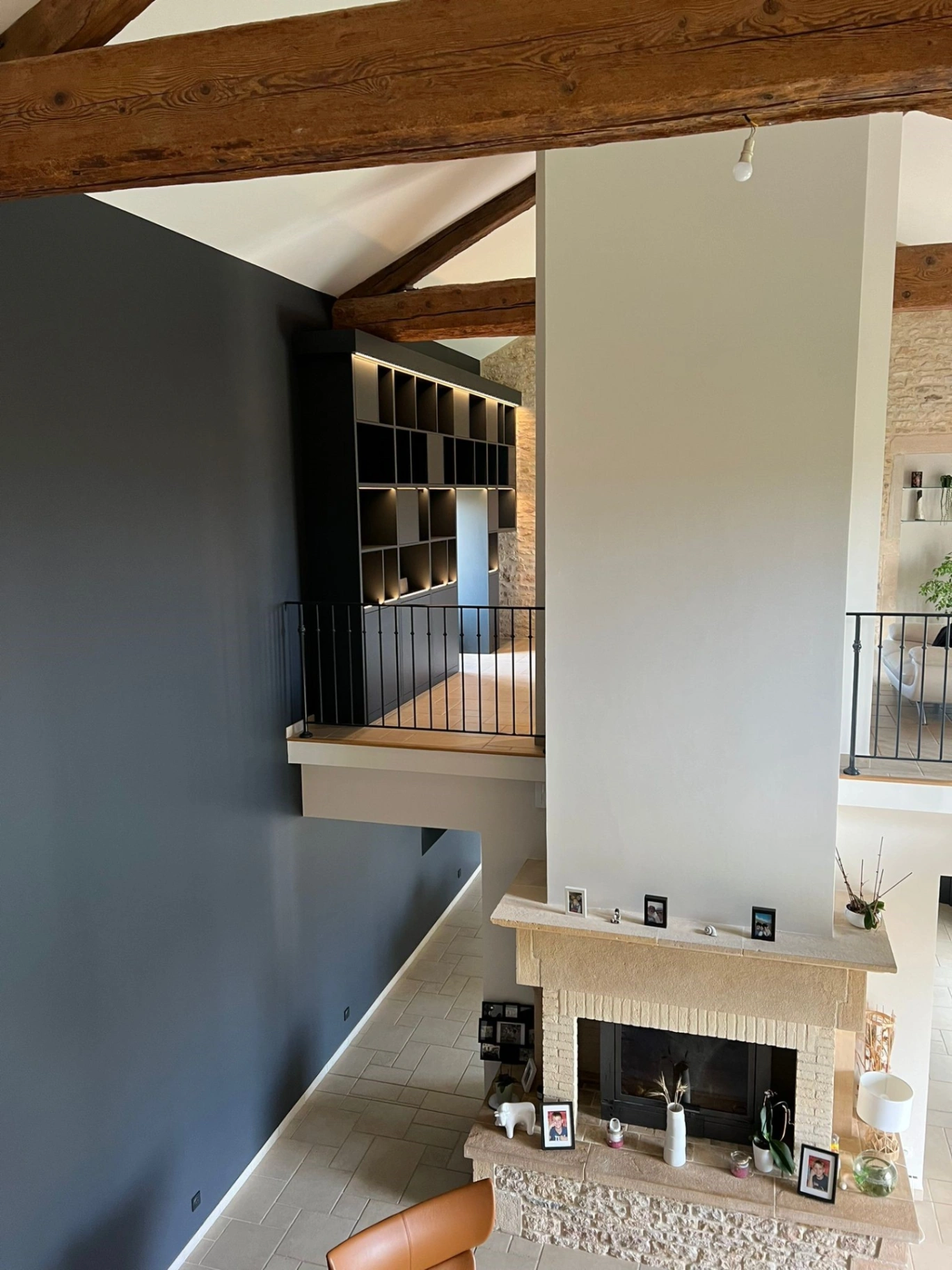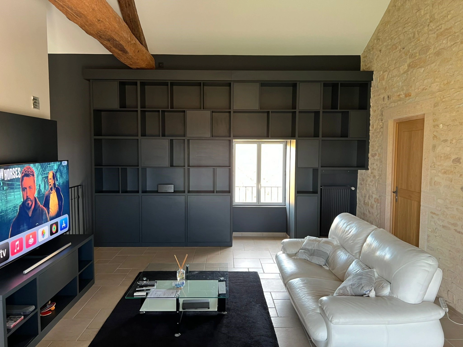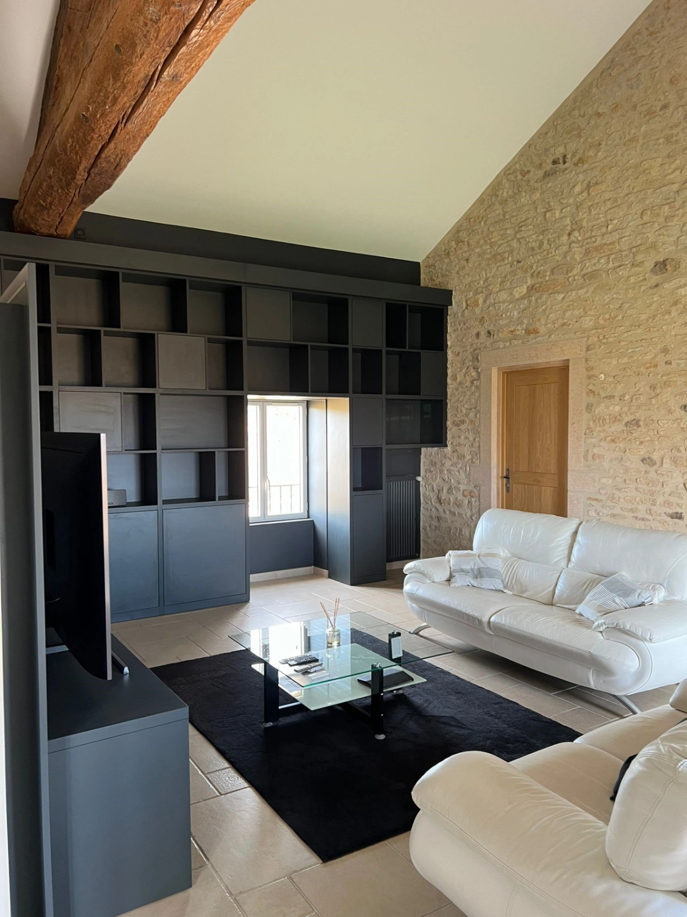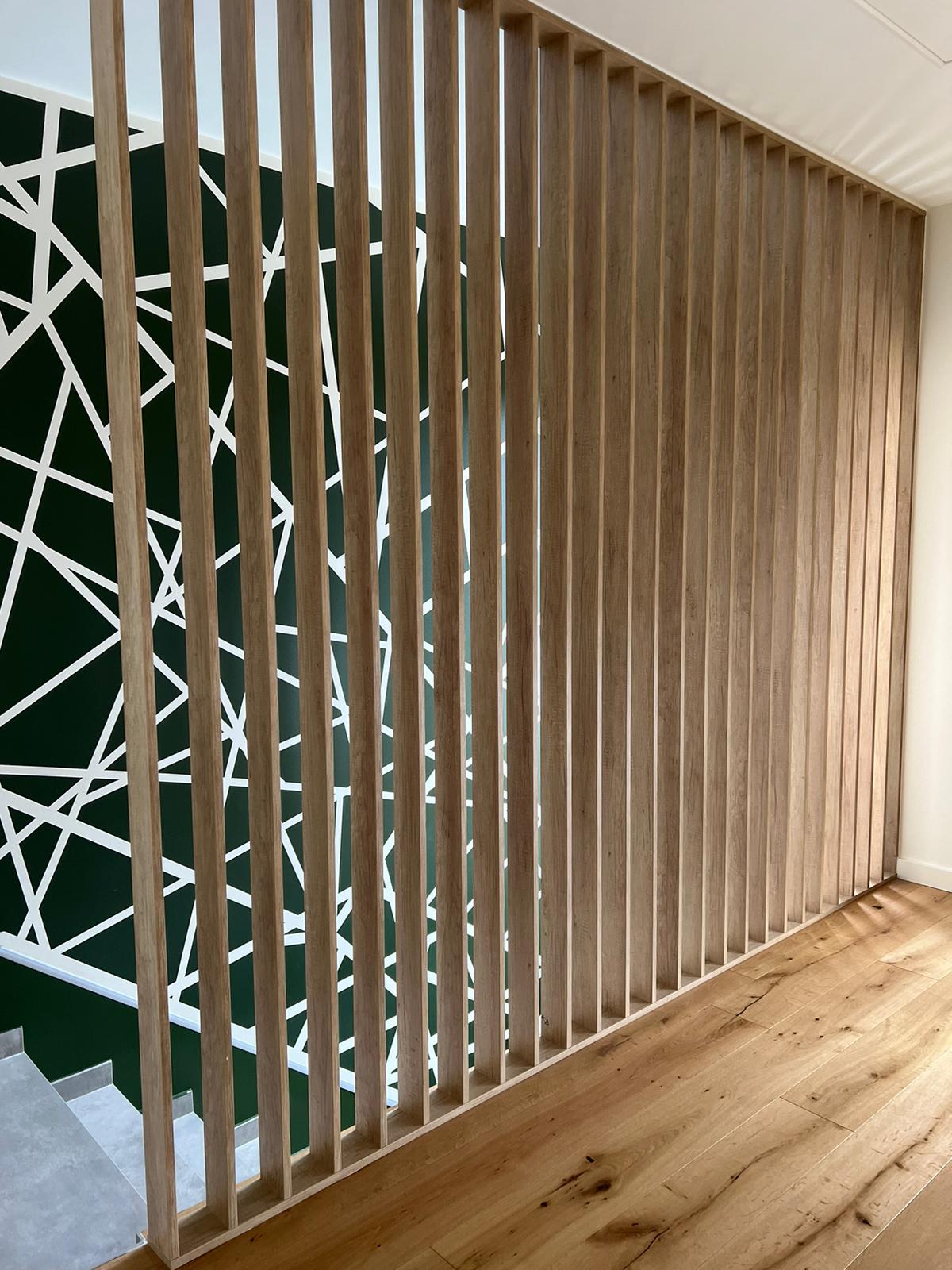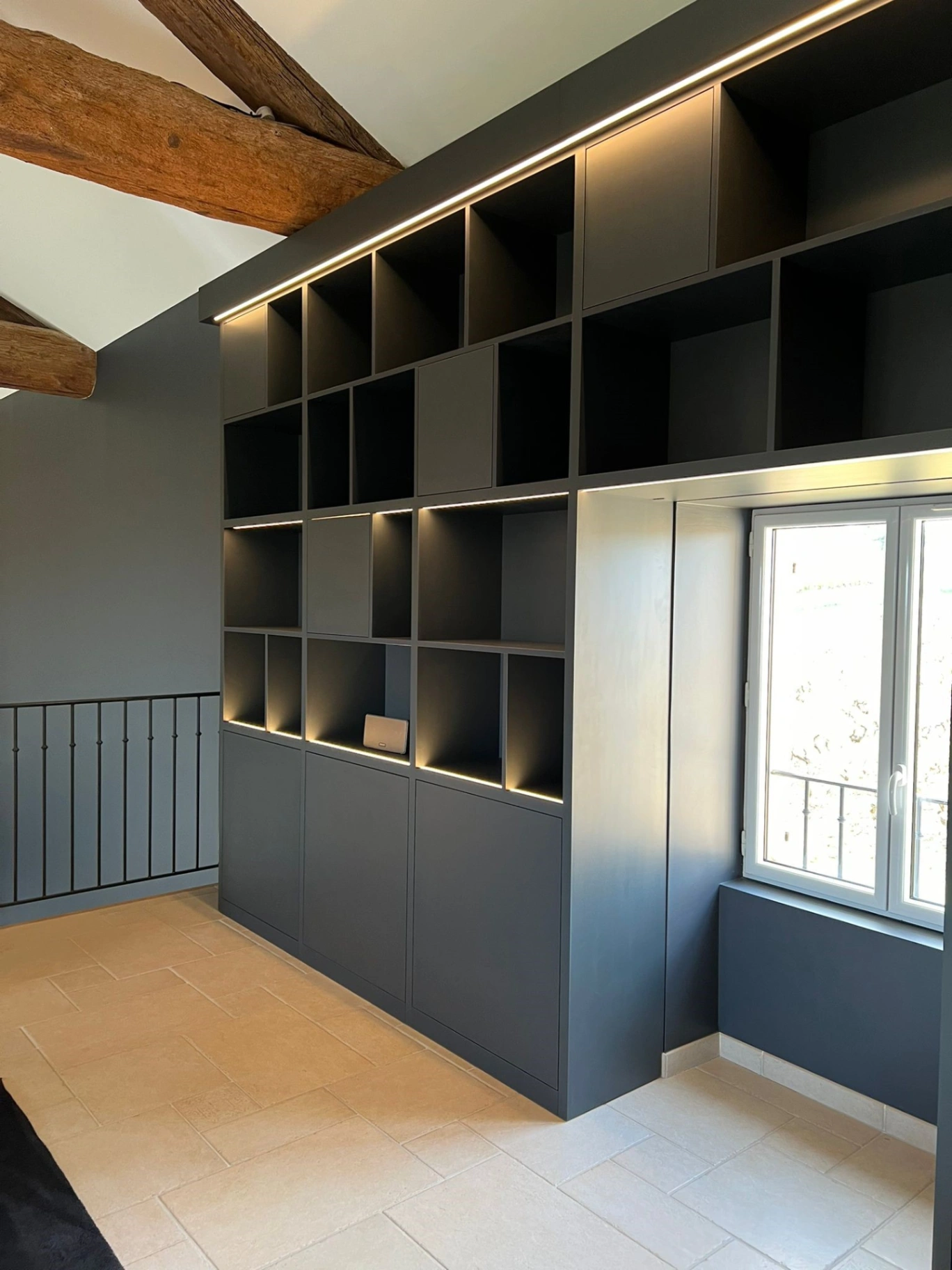 Conception d’un meuble suspendu sur mesure mêlant bois naturel et façades blanches texturées