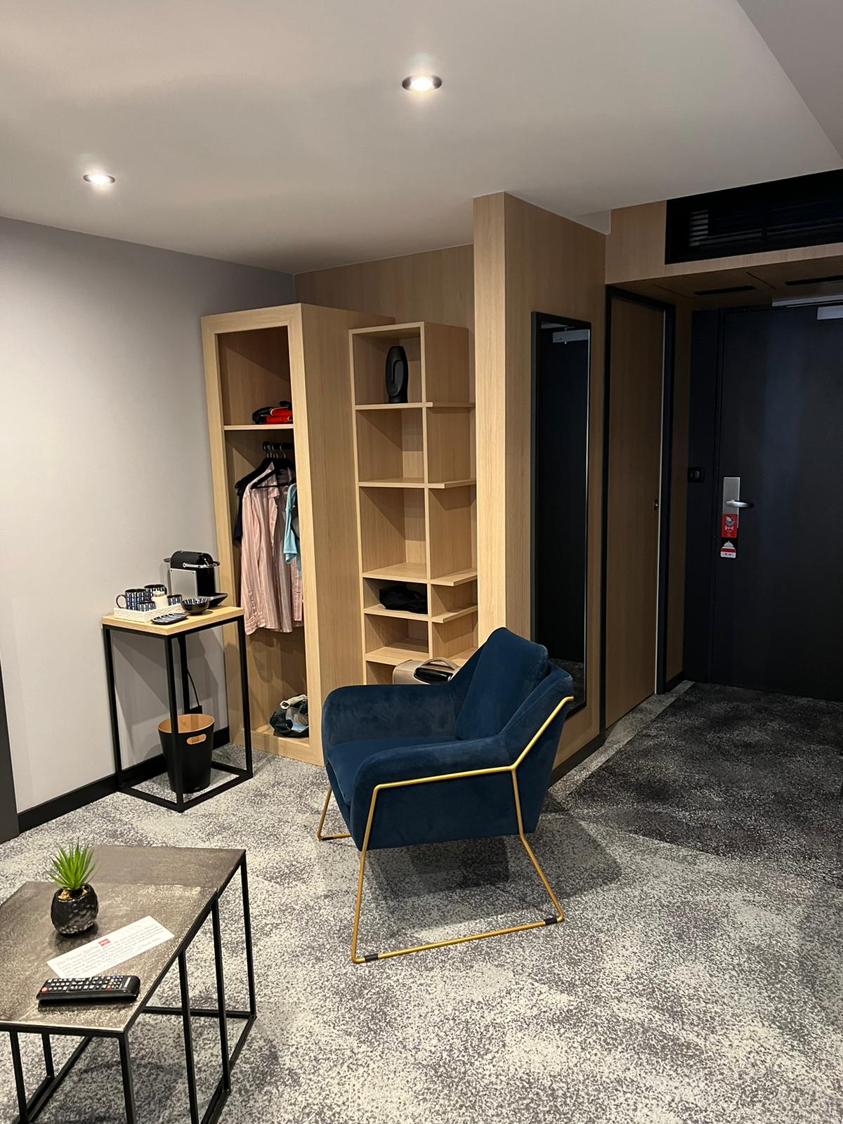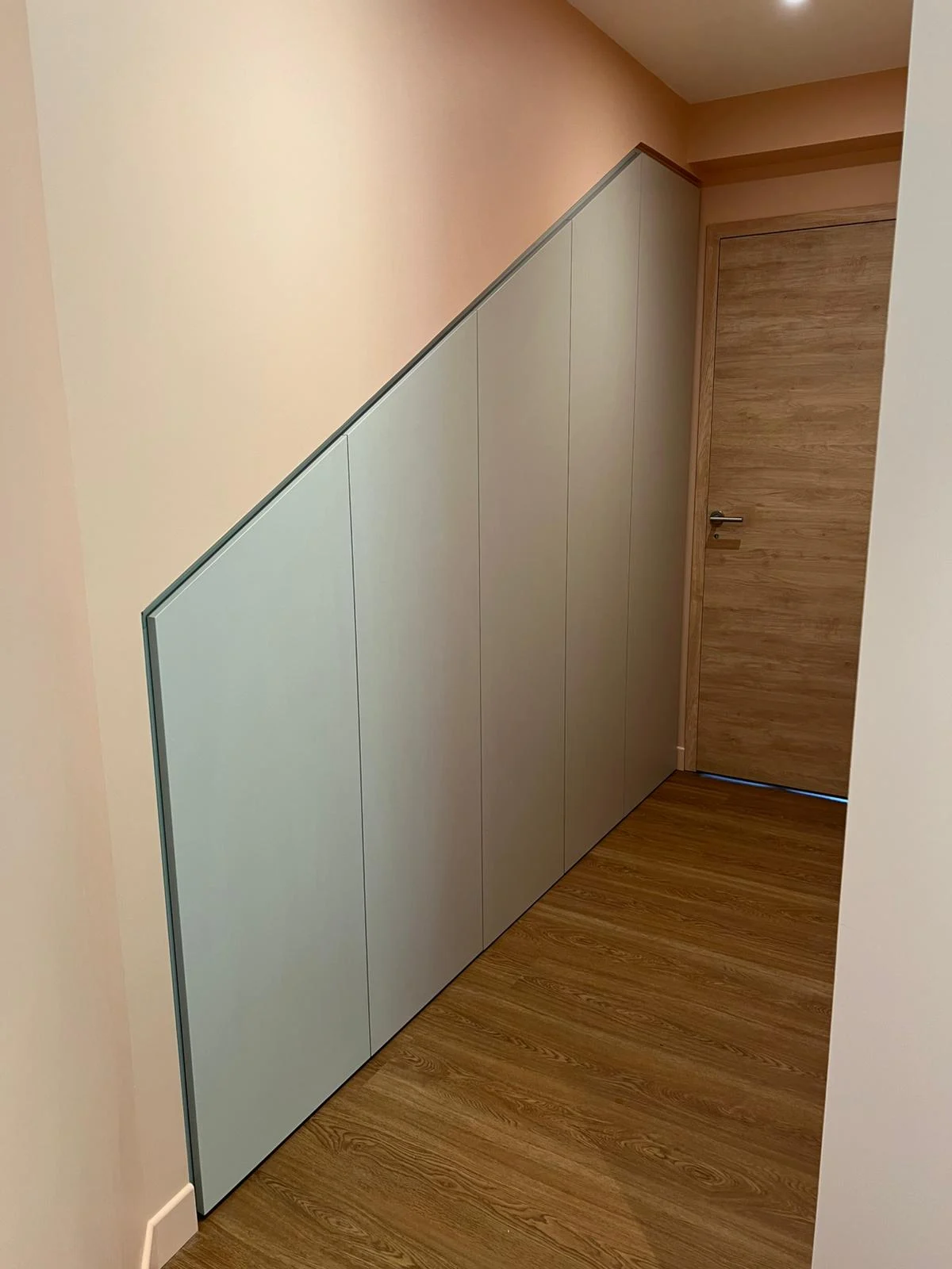 Placard graphique avec niches polygonales découpés et finitions bois clair et blanc mat