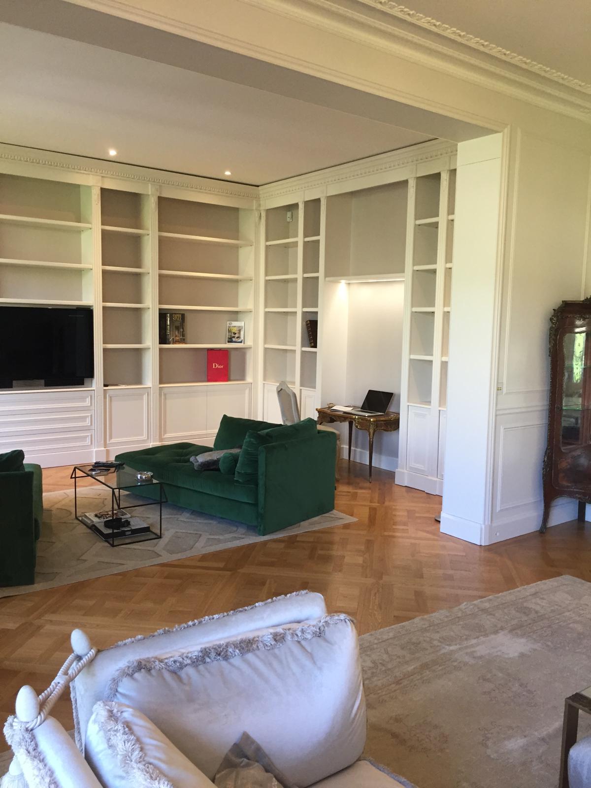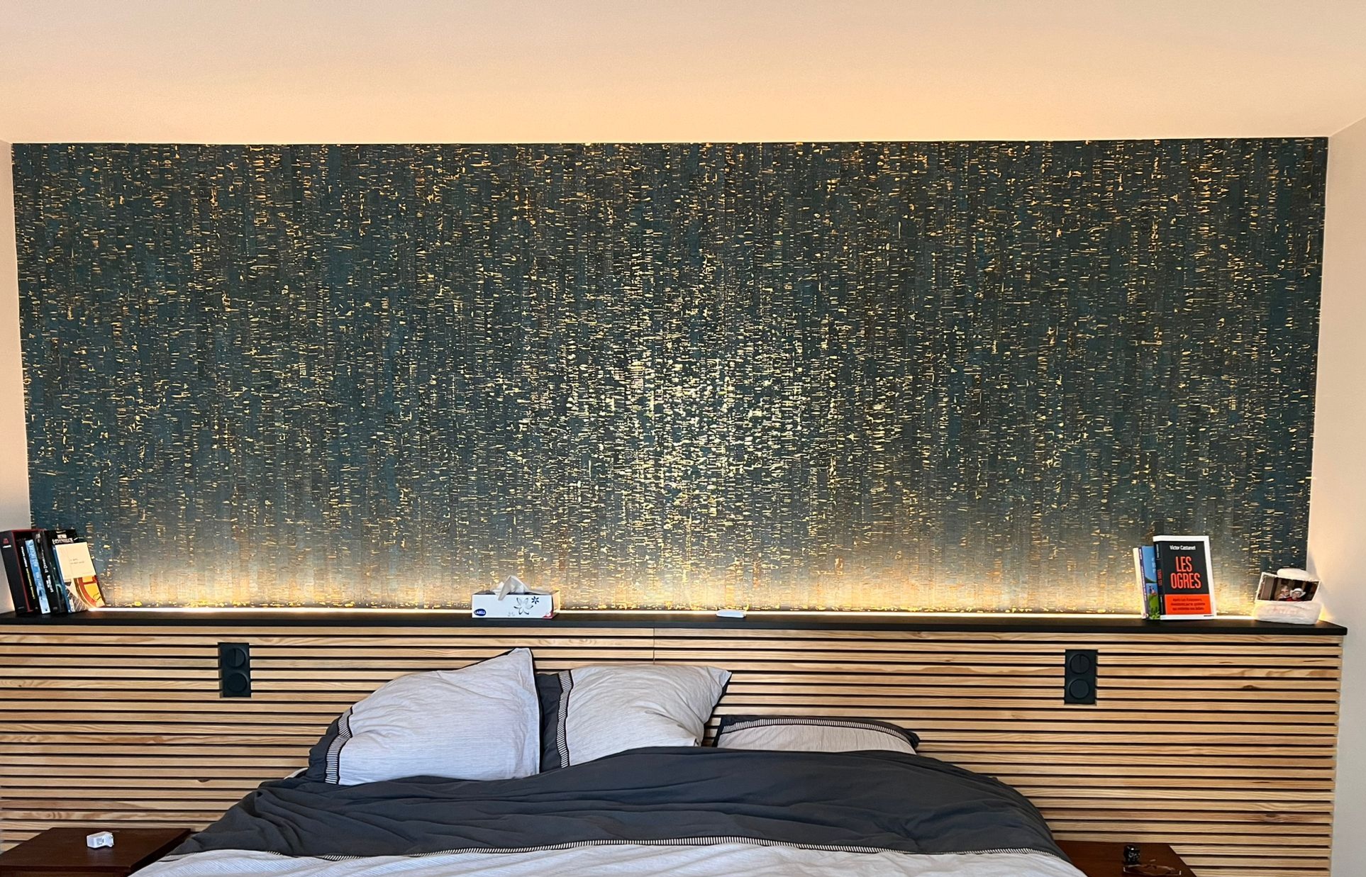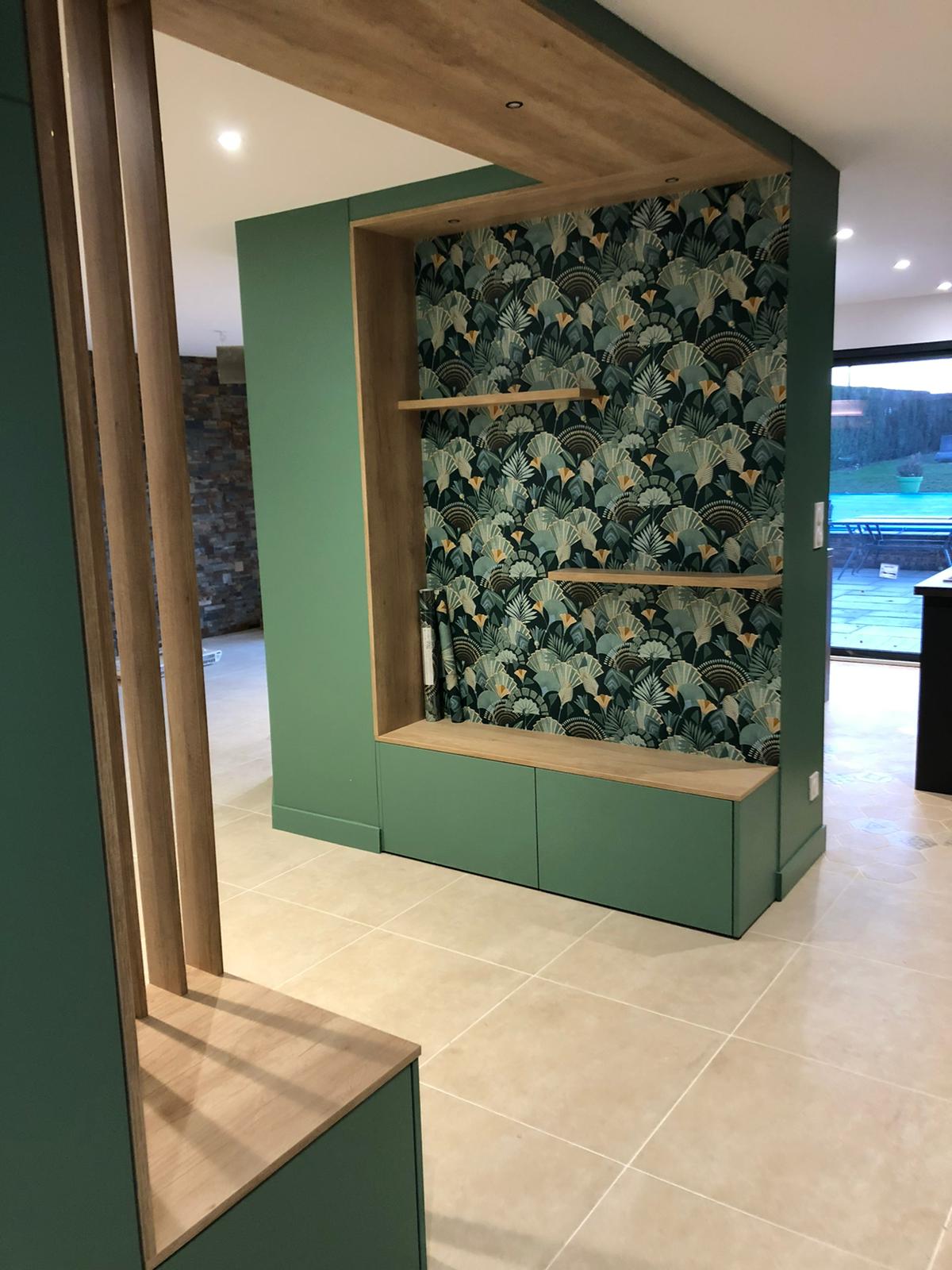 Niche décorative sur mesure avec papier peint art déco et finitions bois et vert céladon