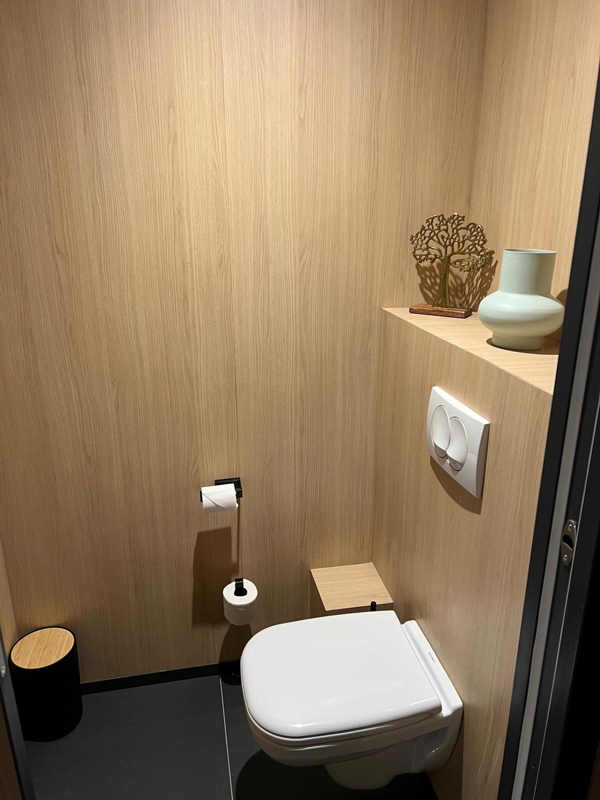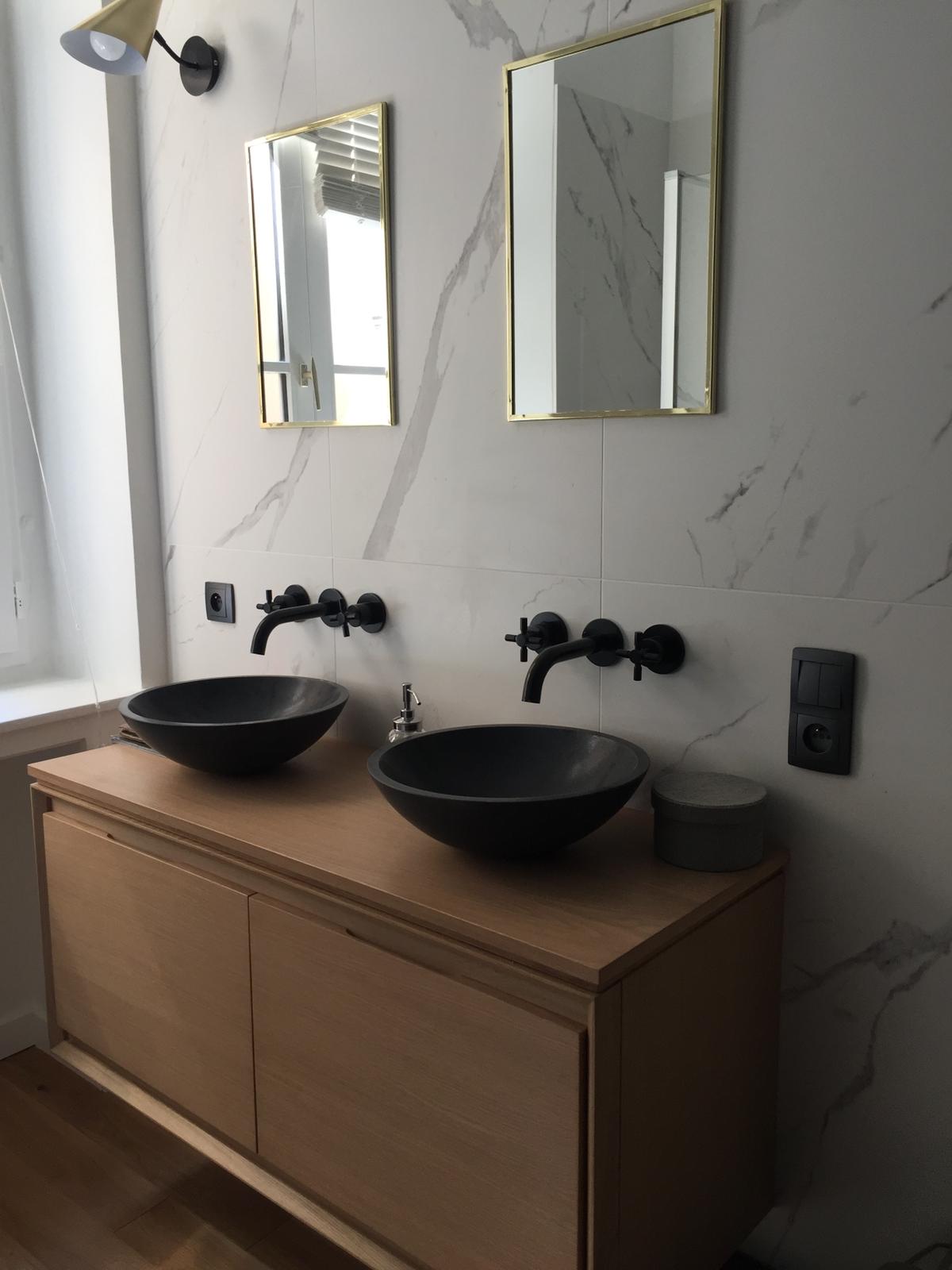 Salle de bain épurée avec meuble en chêne, vasques noires et robinetterie murale mate