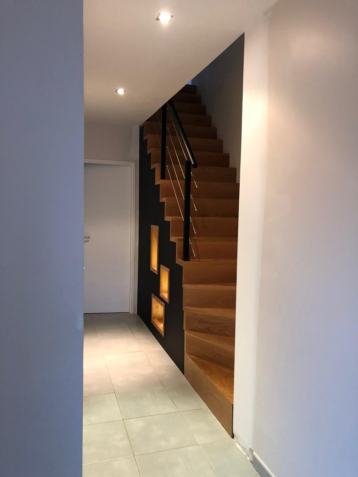 Escalier contemporain en bois avec contremarches et aménagement sous escalier avec niches rétroéclairées