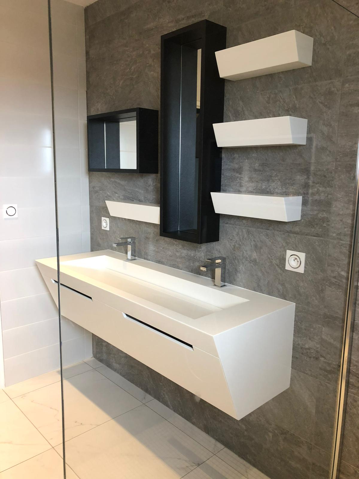 Salle de bain contemporaine avec mobilier suspendu géométrique et contrastes noir & blanc